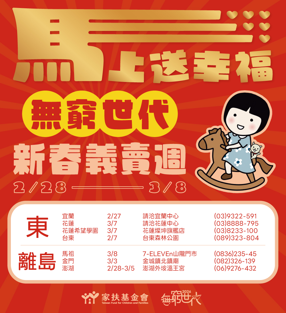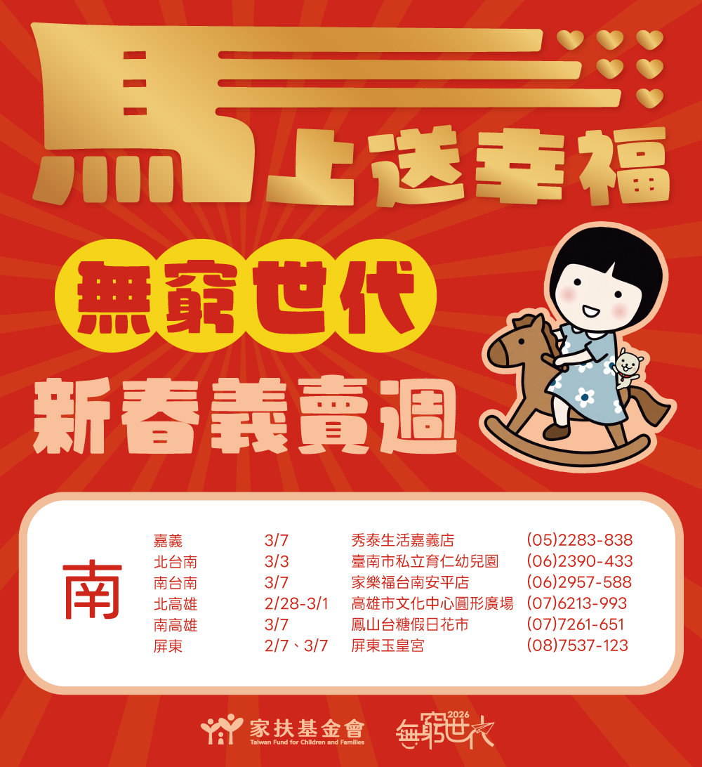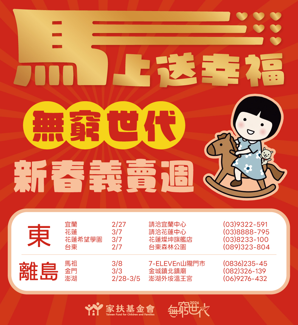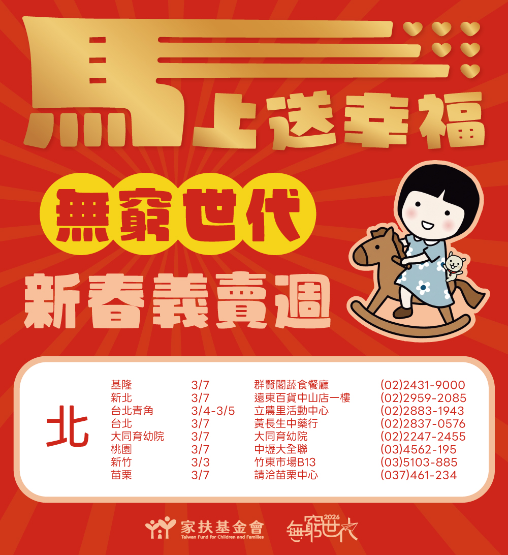 「2026無窮世代新春義賣週」正式起跑,家扶基金會串聯全台各中心,期間辦理134場義賣活動,邀您一起為弱勢家庭應援。挖寶買好物、做公益,新的一年就從義賣週開始!