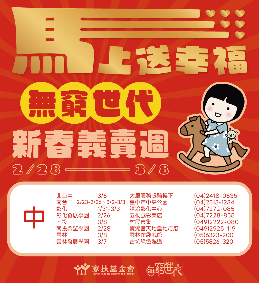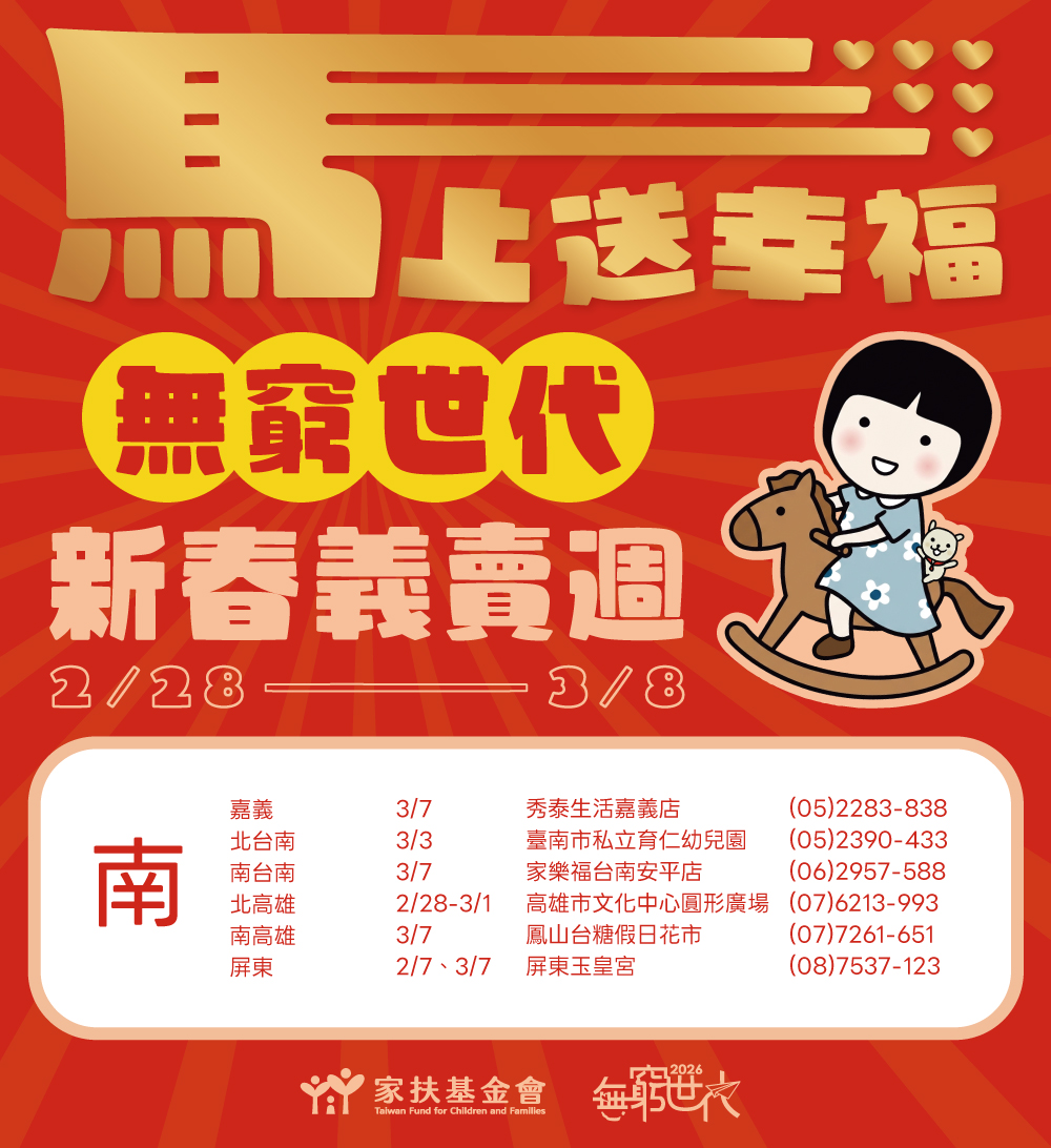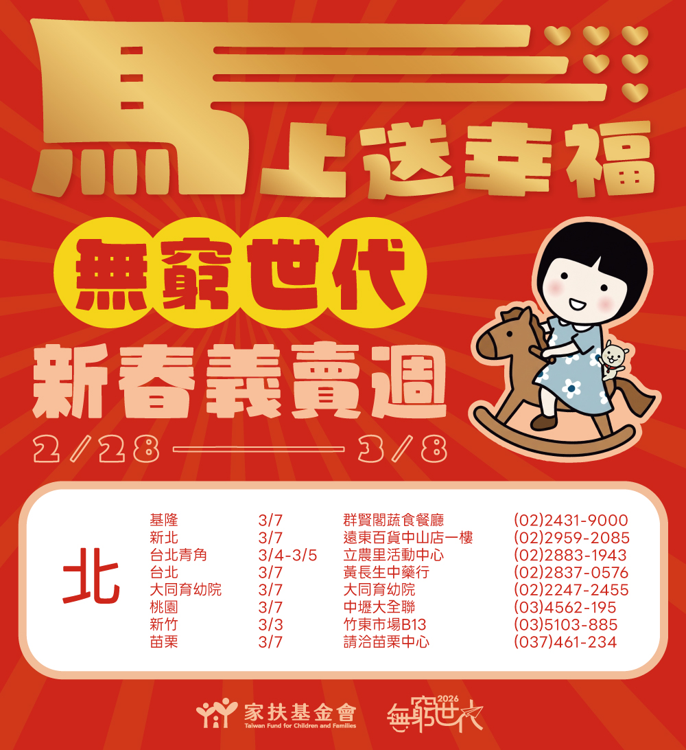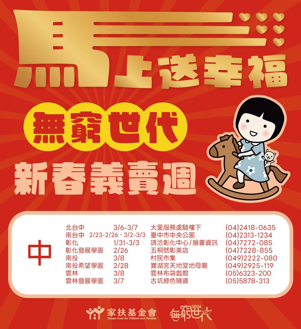 「2026無窮世代新春義賣週」正式起跑,家扶基金會串聯全台各中心,期間辦理134場義賣活動,邀您一起為弱勢家庭應援。挖寶買好物、做公益,新的一年就從義賣週開始!